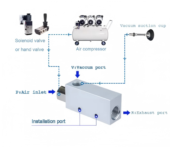 vaakumpumbad ja vaakumgeneraatorid. Vaakumpump on mehaaniline seade, mis tekitab imiavas alarõhu ja laseb väljalaskeaval otse atmosfääri läbida, kusjuures gaasi eraldamiseks on mõlemas otsas kõrge rõhusuhe. Vaakumgeneraator on pneumaatiline komponent, mis kasutab suruõhu voolu teatud vaakumitaseme moodustamiseks. Võrreldes vaakumpumbaga, on sellel lihtne struktuur, väike maht, kerge kaal, madal hind, mugav paigaldus, lihtne tugikomponentidega ühendamine, vaakumi kiire tekitamine ja vabastamine ning see sobib katkendlikuks tööks madala voolukiirusega, sobib hajutatud kasutamiseks