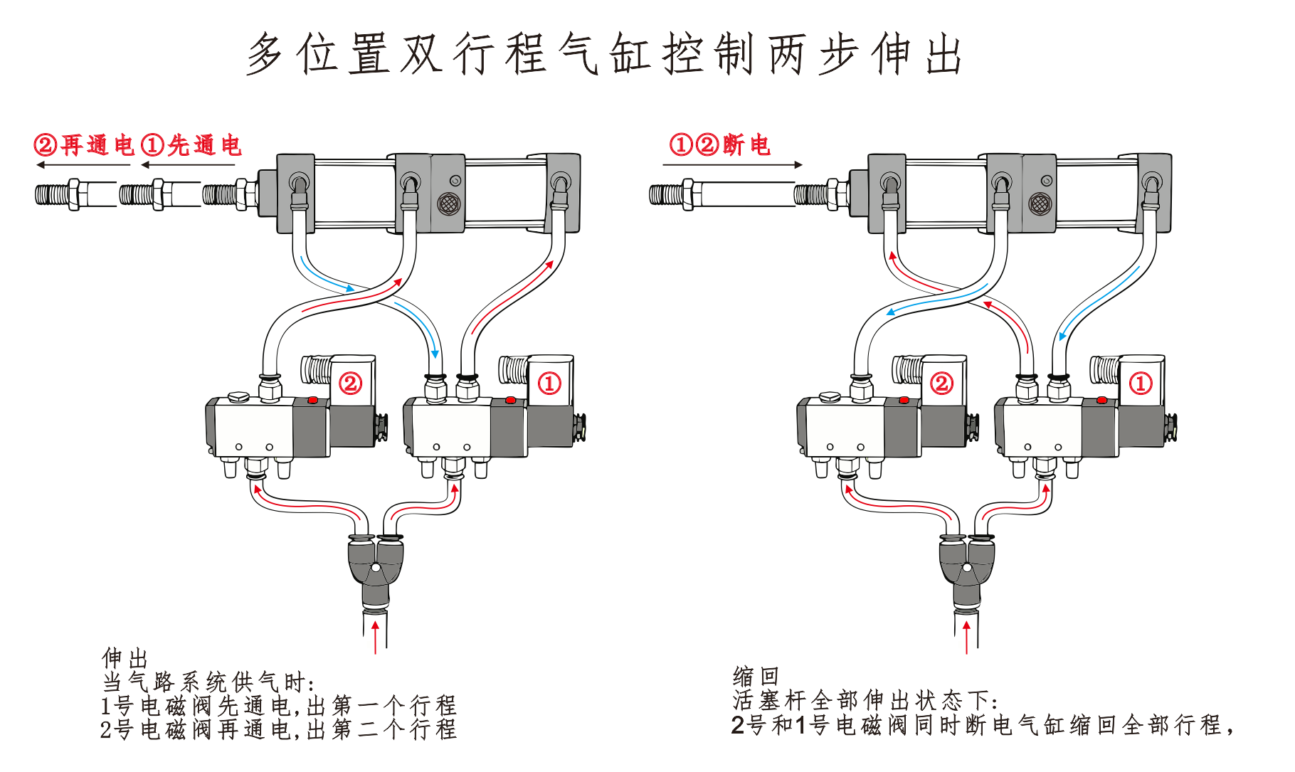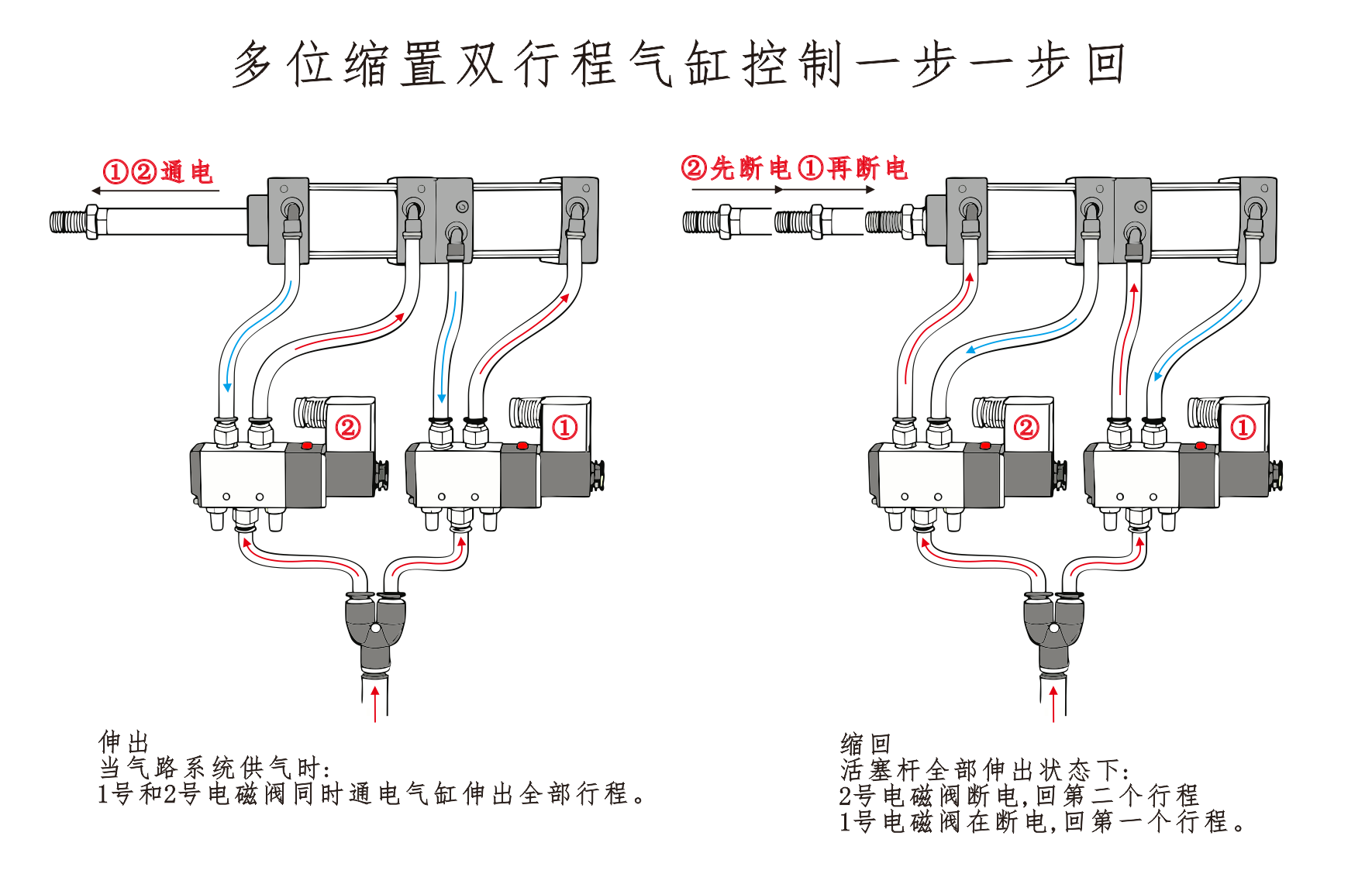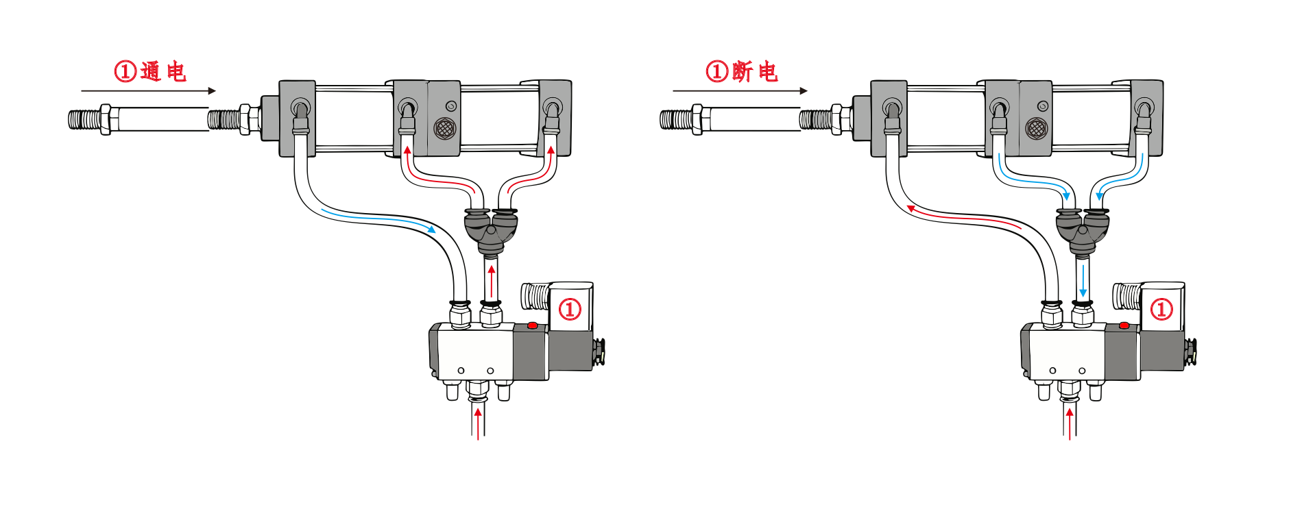 Silindri ① õhu sisselaskeava on ühendatud solenoidklapi pordiga A ja silindri ④ õhu sisselaskeava on ühendatud järjestikku solenoidklapi pordiga B. Silindri③ õhu sisselaskeava on ühendatud summutiga. Kui solenoidklapi port A on pinge all, jäävad silindrid sissetõmmatud asendisse. Kui port B on pingestatud, hakkavad silindrid tööle.