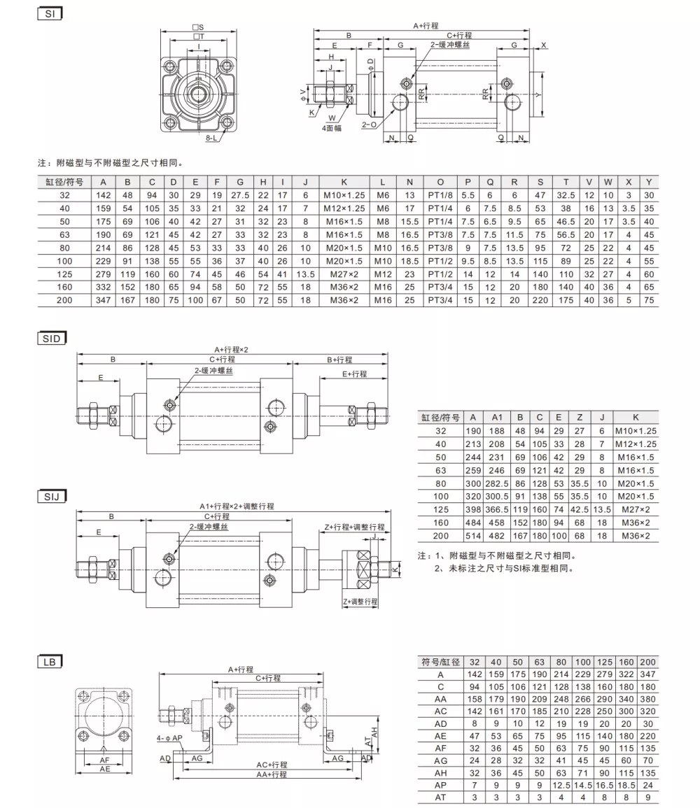 SI-seeria ISO15552 standardsed pneumaatilised silindrid on saadaval kolme tüüpi: standardne kahetoimeline, SID kahevardaline kahetoimeline ja SIJ kahevardaline kahetoimeline reguleeritava käiguga. Need vastavad ISO 15552 standardile, mis tähendab, et nende paigaldusmõõtmed on suuremad kuiFiksuoti priedaisama suurusega. Fikseeritud tarvikud ei ole omavahel asendatavad ja ühilduvad ainult ISO 15552 (endine ISO 6431) spetsifikatsioonidega.