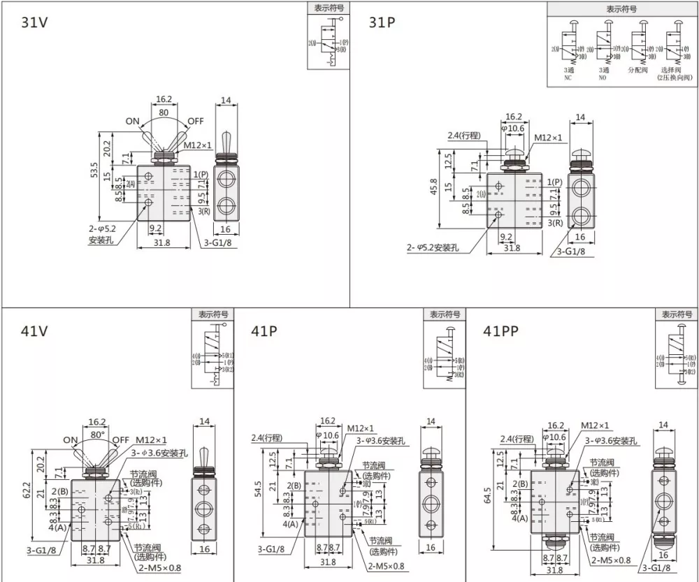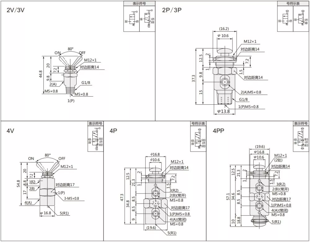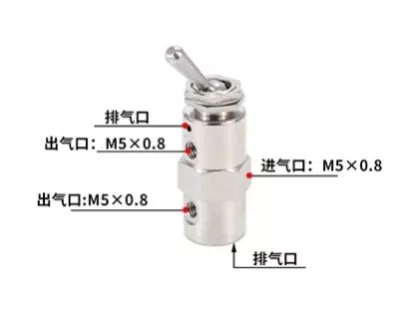 TAC -seeria lülitusventiilil on 2 positsiooni 2 -suunalist, 2 -positsiooni 3 -suunalist ja 2 positsiooni 5 suunas. Viieldage kangi tüüpi ja kahte tüüpi niit: M5, G1/8.